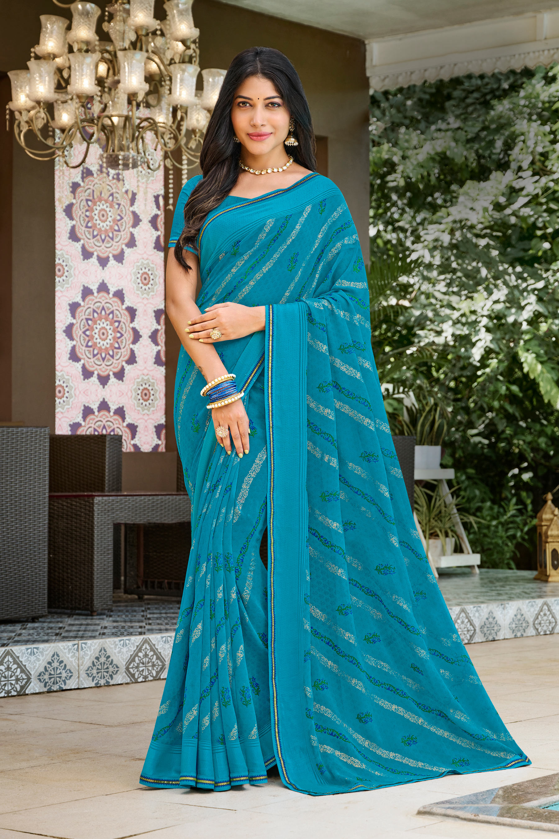 N-2199 Laxmipati Chiffon Blue Color Stripe Print With Lace borader