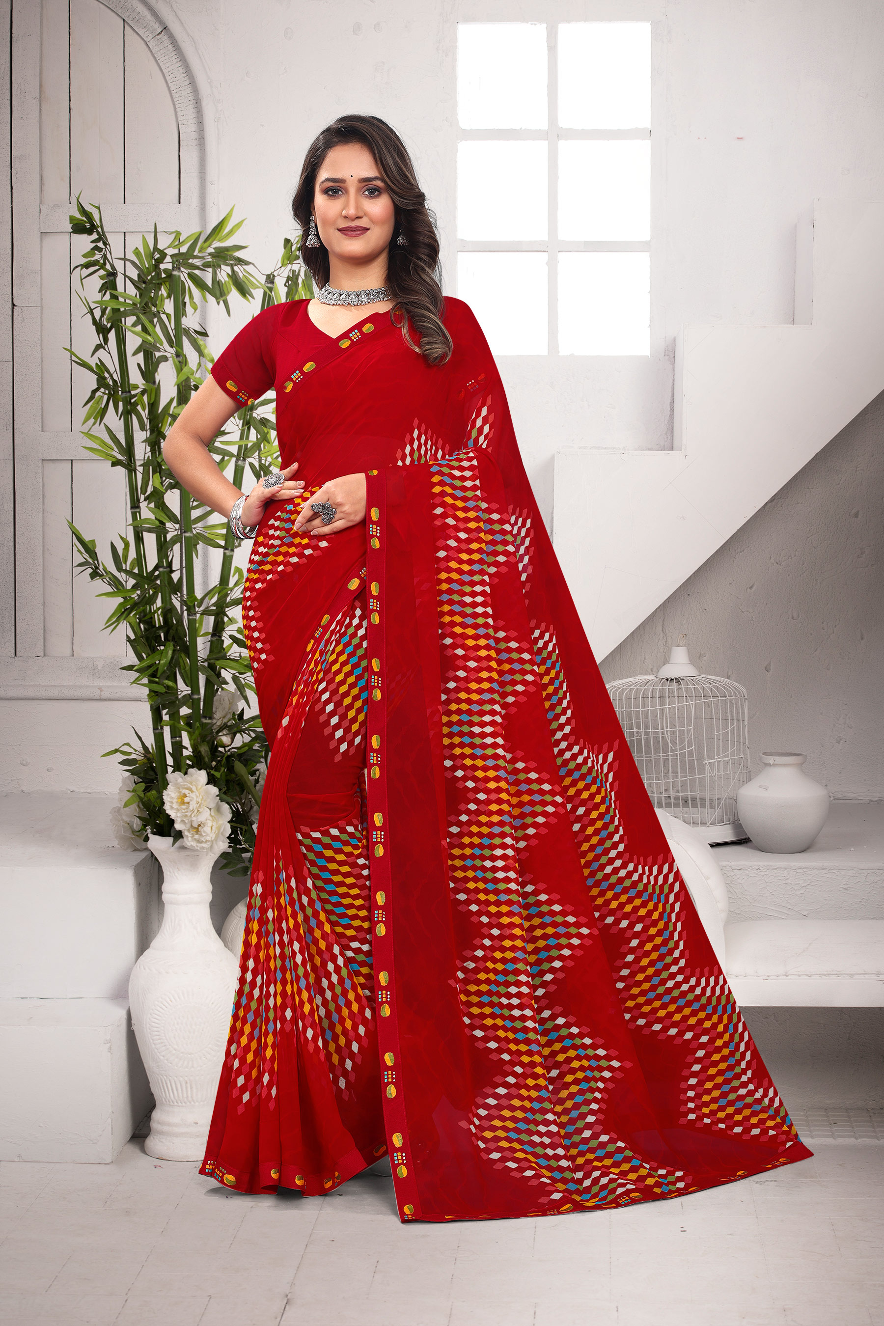 Georgette Red Color Saree Geometric Print with Lace Borad